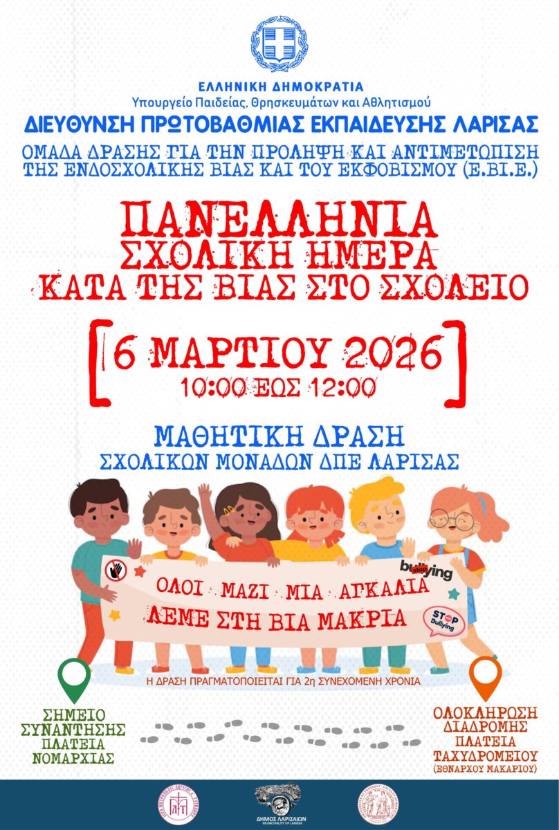 Με κεντρικό μήνυμα την πρόληψη και την αντιμετώπιση της σχολικής βίας και του εκφοβισμού, πραγματοποιήθηκε την Παρασκευή στη Λάρισα η μαθητική εκδήλωση με τίτλο «Όλοι μαζί μια αγκαλιά, λέμε στη βία “μακριά”».