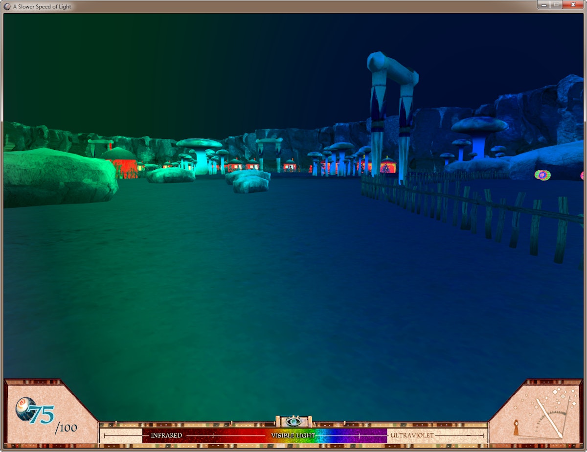 To slower speed of light είναι ένα πρωτότυπο παιχνίδι πρώτου προσώπου στο οποίο οι παίκτες περιηγούνται σε έναν τρισδιάστατο χώρο ενώ μαζεύουν σφαίρες που μειώνουν την ταχύτητα του φωτός σε βήματα. Ο προσαρμοσμένος κώδικας σχετικιστικών γραφικών ανοιχτού κώδικα επιτρέπει στην ταχύτητα του φωτός στο παιχνίδι να προσεγγίζει τη μέγιστη ταχύτητα περπατήματος του ίδιου του παίκτη. Τα οπτικά εφέ της ειδικής σχετικότητας γίνονται σταδιακά εμφανή στον παίκτη, αυξάνοντας την πρόκληση του παιχνιδιού. Αυτά τα εφέ, που αποδίδονται σε πραγματικό χρόνο με ακρίβεια κορυφής, περιλαμβάνουν το φαινόμενο Doppler (μετατόπιση κόκκινου και μπλε του ορατού φωτός, και τη μετατόπιση του υπέρυθρου και υπεριώδους φωτός στο ορατό φάσμα). το εφέ του προβολέα (αυξημένη φωτεινότητα προς την κατεύθυνση του ταξιδιού). διαστολή χρόνου (διαφορές στο αντιληπτό πέρασμα του χρόνου από τον παίκτη και τον έξω κόσμο). Μετασχηματισμός Lorentz (στρέβλωση του χώρου σε ταχύτητες σχεδόν φωτός). και το φαινόμενο χρόνου εκτέλεσης (η ικανότητα να βλέπει κανείς τα αντικείμενα όπως ήταν στο παρελθόν, λόγω του χρόνου ταξιδιού του φωτός). Το A Slower Speed of Light συνδυάζει προσβάσιμο παιχνίδι και ένα σκηνικό φαντασίας με θεωρητική και υπολογιστική έρευνα φυσικής για να προσφέρει μια συναρπαστική και παιδαγωγικά πλούσια εμπειρία. Κατεβάστε την παρουσίασή μας στο PowerPoint σχετικά με τα σχετικιστικά εφέ στο παιχνίδι: PPT PPTX